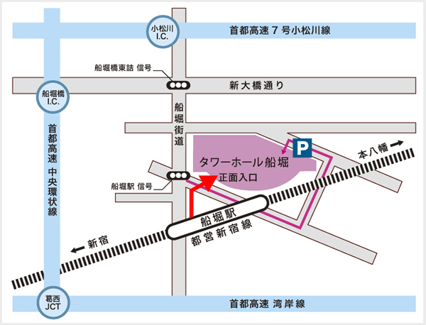 新宿駅より「都営新宿線」にて本八幡方面へ約30分。船堀駅下車、徒歩約1分。