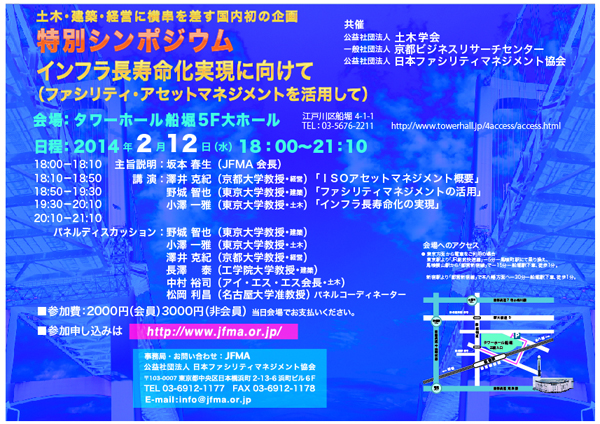 このような背景の中、このたびAMを推進する土木技術関係者、FMを推進するJFMA関係者および所轄官庁関係者を一堂に会したシンポジウムを開催することにより、関係団体に横串をさして関係者間の連携を図り、以って国家的課題となった「インフラ長寿命化」の実現に貢献するきっかけとしたいと存じます。